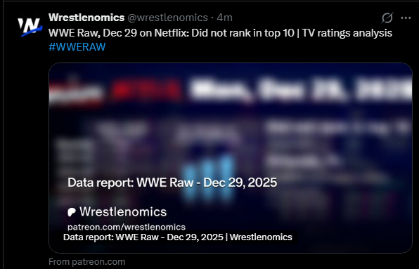 >>19636308Do you mean the Top 10 chart that ends at 1/4, the day before Raw aired? Of course a pre-taped Raw isn't going to chart well. People skipped watching to spend time with their families on the holidays. The shows 25 years ago that were pre-empted by the Westminster Dog Show got shit ratings too.