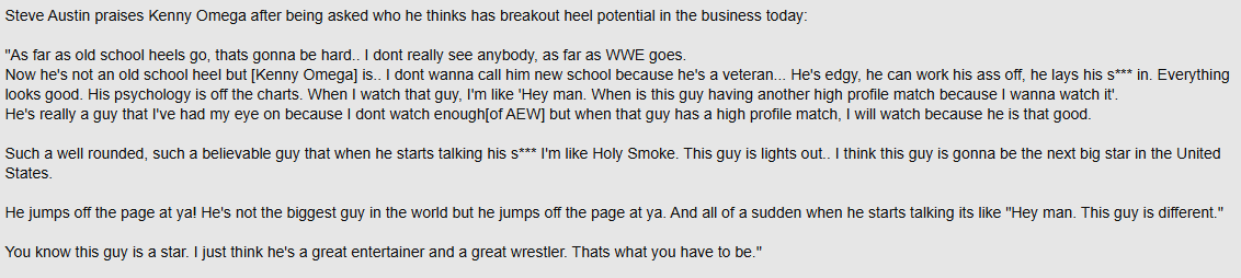 >>19639069they were over becuase he was doing it to vince mcmahon who they had just seen him spend 2/3 of the show arguing with or getting arrested or fired by or whateveri don't want to put words in your mouth but i get frustrated by this line of reasoning because it feels very smark-ish to me and then it's used by the same people who will then go on to use smark as a pejorativethe attitude era in-ring product was, largely, garbage. so i find it highly condescending and stupid for austin to be telling anyone how they need to learn how to sell or work when that had zero to do with what made him specifically special