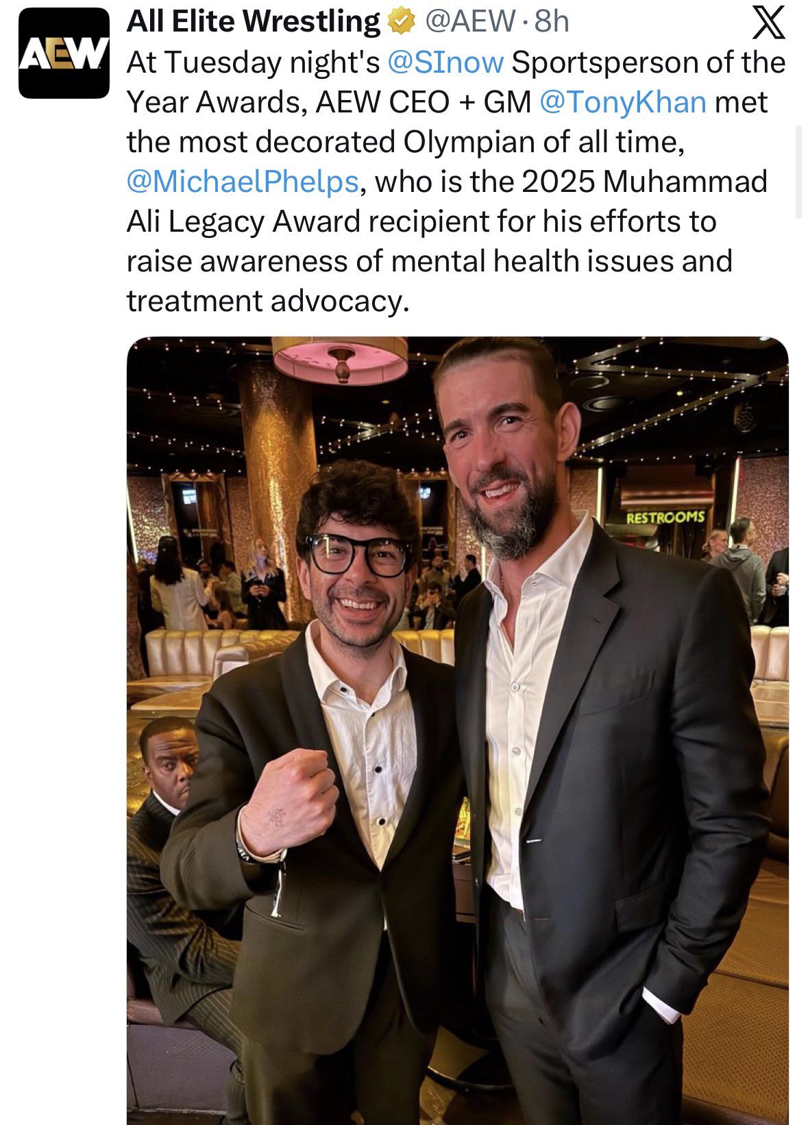 >>19641771>@MichaelPhelps, who is the 2025 Muhammad Ali Legacy Award recipient for his efforts to raise awareness of mental health issues and treatment advocacy.>introduced to Tony Khanwhy would they word the tweet like this?