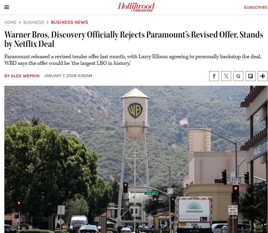 The hostile takeover of Paramount has been REJECTED by the WBD BOARD (partial stakeholders in AEW). What will Netflix do with their stake in OUR AEW???????? Will they even buy it????>Even after David Ellison’s Paramount filed a revised tender offer for the company Dec. 22, with Larry Ellison personally promising a full backstop on the deal, the WBD board released a letter Wednesday morning rejecting the new offer and sticking with its signed agreement with Netflix.>The revised offer also saw Paramount increase the termination fee to $5.8 billion, matching Netflix, and extending the deadline for the tender to later in January. The company kept its offer price at $30 per share, all cash.>But WBD’s board argued that the changes were not enough to persuade it to change its mind.>“Your Board unanimously determined that the PSKY amended offer remains inadequate particularly given the insufficient value it would provide, the lack of certainty in PSKY’s ability to complete the offer, and the risks and costs borne by WBD shareholders should PSKY fail to complete the offer,” the WBD board wrote.https://www.hollywoodreporter.com/business/business-news/warner-bros-discovery-rejects-paramount-revised-offer-1236457301/
