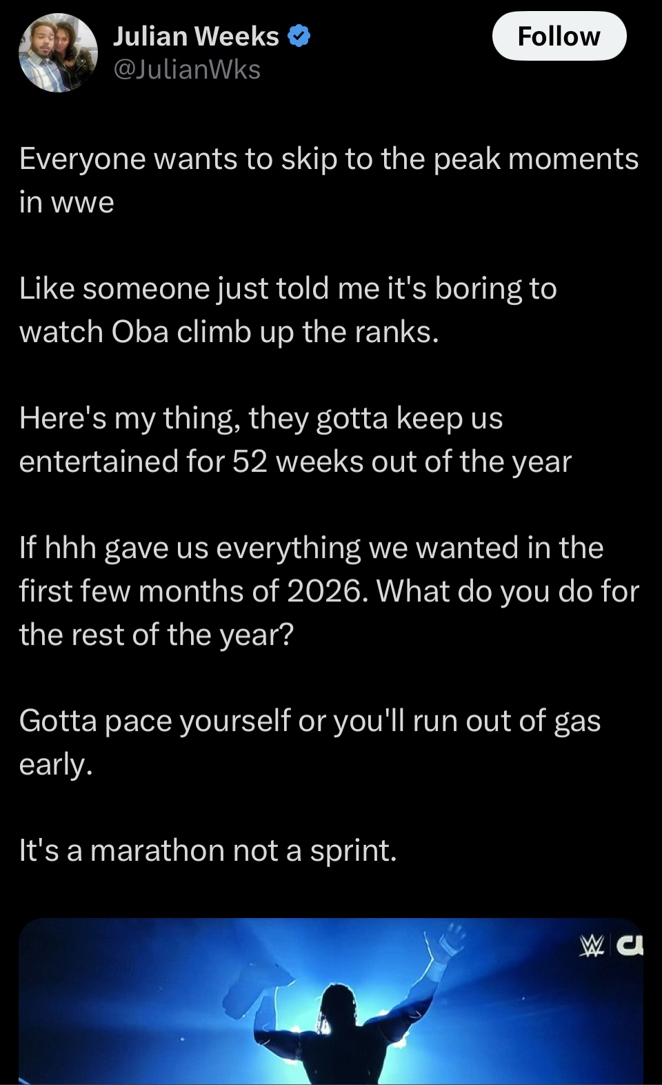 >Dude, just wait! On December 31st 2026 at 11:59 PM LA Knight will win a world title! Just wait a little longer! Trvst the plan!