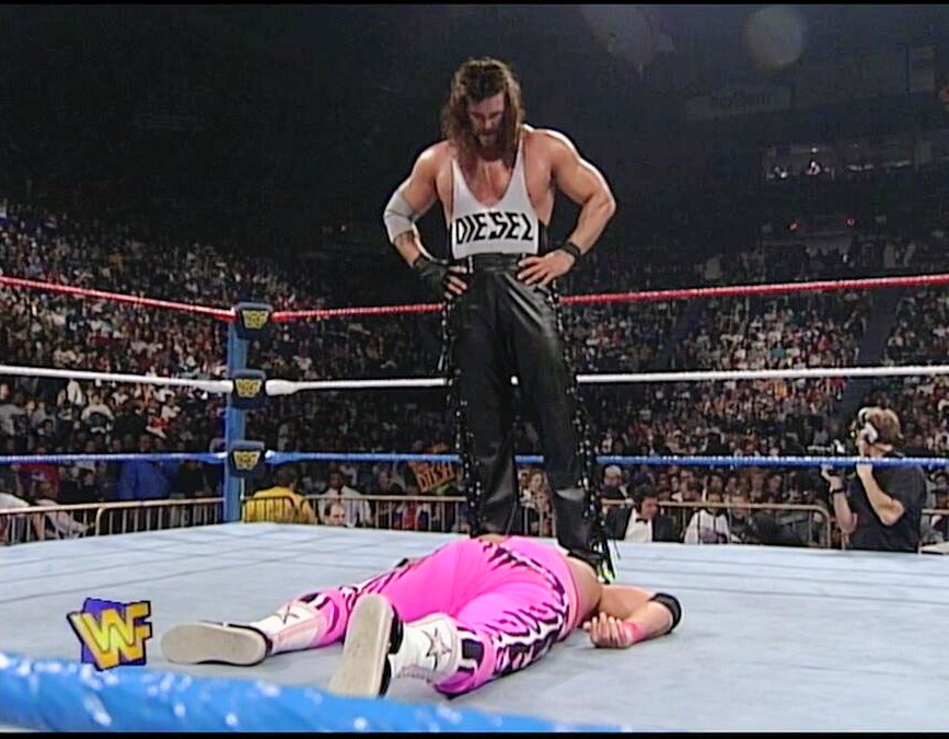 In a packed arena, Diesel, known for his towering presence, was wrestling a fierce match against Bret Hart. But tonight, something felt off. The crowd sensed the tension; Big Daddy Cool’s demeanor was dark and unpredictable. As the match escalated, Diesel's frustration reached its peak and he knocked Bret out of the ring. Diesel then suddenly unleashed a fierce kick to the head of the referee, tragically ending the official's life. A second referee entered, but Diesel unleashed a wild fury that also left him lifeless on the mat. Gasps echoed throughout the venue as chaos erupted. Bret, sensing that something had to be done, stumbled back in the ring and lunged at Diesel to restrain him. But in a terrifying moment, Diesel seized Bret and executed a devastating powerbomb, leaving Hart sprawled on the canvas, concussed and dazed. The cheers turned to shocked silence as Diesel stood amidst the wreckage of the match, his sanity unraveling. Overcome by madness, he stripped off his gear, dancing wildly while naked in the ring as if possessed. The crowd was bewildered, unsure whether to cheer or boo the surreal spectacle.Suddenly, Fred Durst stormed the ring, furious at Diesel's antics. With a mic in hand, he unleashed a barrage of angry rap, energizing the audience and distracting Diesel long enough for security to move in. Fred’s commanding presence drove Diesel from the ring amidst the chaos, ending the bizarre episode.But for Bret Hart, the aftermath was grim. Confused and in pain, he would be haunted by the memory of that night, forever believing that it was Bill Goldberg, not Diesel, who had ended his career. The tangled web of conflict and misconception left lasting scars, both in and out of the ring.