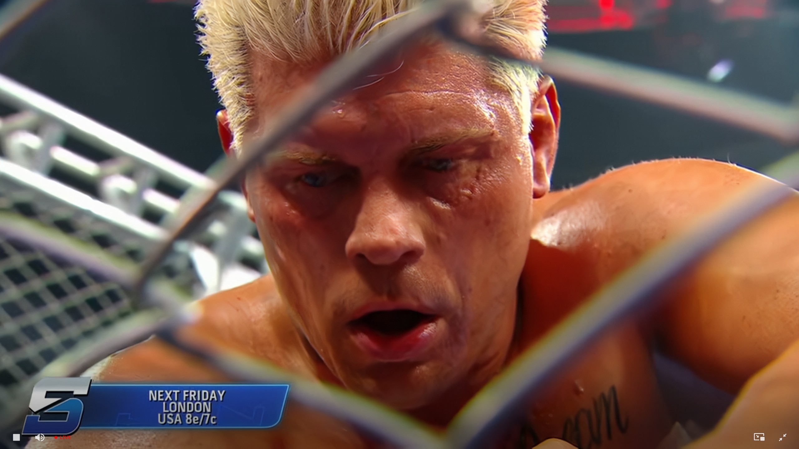 Drew is gonna pull out handcuffs from one of the ring corners. He handcuffs Cody and gloats that he's gonna win. Fatu shows up and slams the door against Drew while the ref uncuffs Cody. Cody hits cross rhodes. Cody wins. You're welcome.