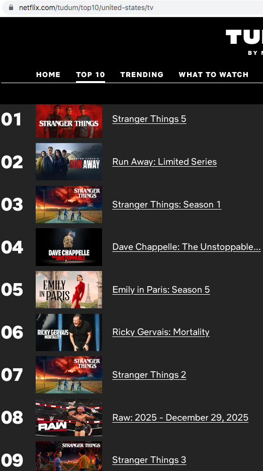 >>19657695>they aren't even charting in the US top 10 anymoreAll AEWtists know how to do is lie.https://www.netflix.com/tudum/top10/united-states/tv