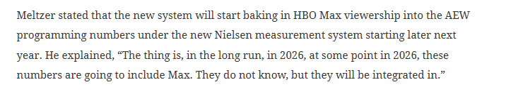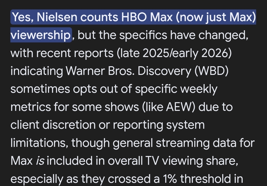 >>19657483>that the company is literal feces coming out of an asshole and that's just that.Nah that's eslop actually.Here's an article from October confirming MAX is still not included in ratings https://wrestlenomics.com/articles/2025/aews-hbo-max-simulcasts-are-not-counted-in-nielsen-tv-ratings-even-under-new-methodology-according-to-wbd/