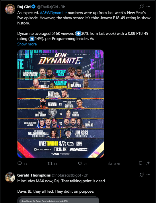 >>19657521>Nielsen will include streaming numbers starting in in January>these ratings are out in January, for an episode of Dynamite that aired in JanuaryMax is included now. 516k. With Max.