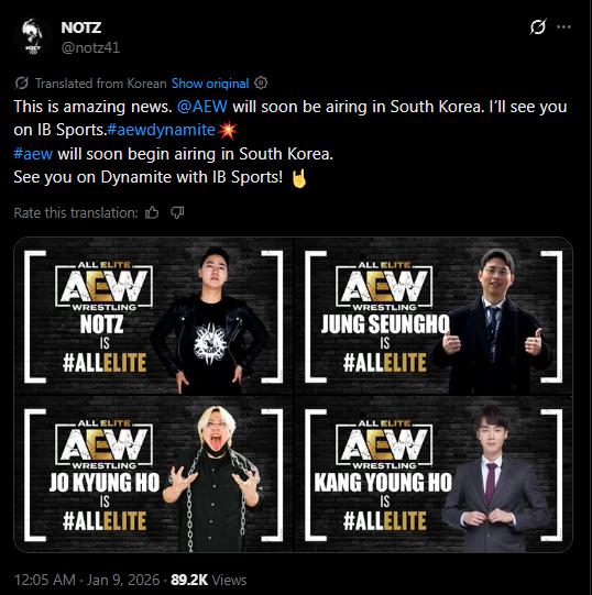 >>19661472Welcome to the team Notz + Jung Seungho + Jo Kyung Ho + Kang Young Ho! I can’t wait for our great fans in South Korea to watch #AEWDynamite on IB Sports COMING SOON!
