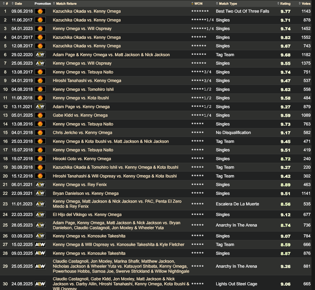 https://www.youtube.com/watch?v=fQcz9j0CeocI remember the powerful wave of momentum he had behind him with his rise to the top of the company. Everybody in the main event scene at that time was just putting on banger after banger and he took the world by storm. Literally the first gaijin to win the G1 since Hogan.Now? He is bloated, busted, missing half of his colon, holding Hangman's dilation wand in his hand as far away from his face as he can because being at AEW show is rancidly odious enough as it is, he's got that 1000 cock stare, he had to punch another notch hole into his belt to hold up his denims around his expanding roid gut because he's too arsed to even bother wearing ring gear, the life and youth are out of his eyes, he's probably in some sort of CTE moment of regret and dull recollection of better times in Japan while hanging and banging with Ibushi, he has Oprah Winfrey biceps with what looks like cakemix inside his arms, he's in a state of nihlistic malaise over how much video games suck these days, his hair looks somehow worse.This isn't some hot dog and handshake ham and egger. This is Kenny fucking Omega. We all watched him climb from the bottom to the absolute top of the mountain during New Japan's renaissance; IWGP Heavyweight Championship, the IWGP Intercontinental Championship, they had to create the IWGP United States Heavyweight Championship for him to cool him down for his world title run, the NEVER Openweight 6-Man Tag Team and IWGP Jr. Heavyweight tag and singles belt. He won the G1 and ran Bullet Club. This fucker was THE guy; he ticked all the boxes of an international star. His run was legendary in that company and there was no signs they weren't going to bend the world over backwards to keep him there and happy.Now he can't even run his refrigerators bluetooth ice machine. This is the fat Axl Rose part of his career. The Terminator movies has cursed him into becoming current Ed Furlong