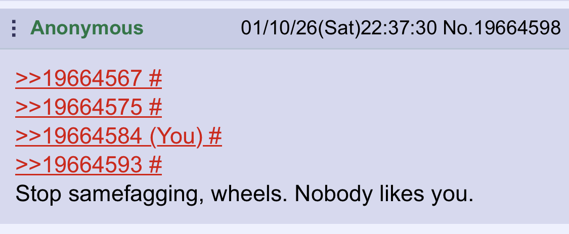 >>19663919But, you are? We've been through this, wheels.You're known for this. Astroturfing support for yourself because nobody else likes you.>>19663923>>19663932One guy. Two devices.I really think you overestimate how popular this board is, wheels. Have you seen the traffic numbers?