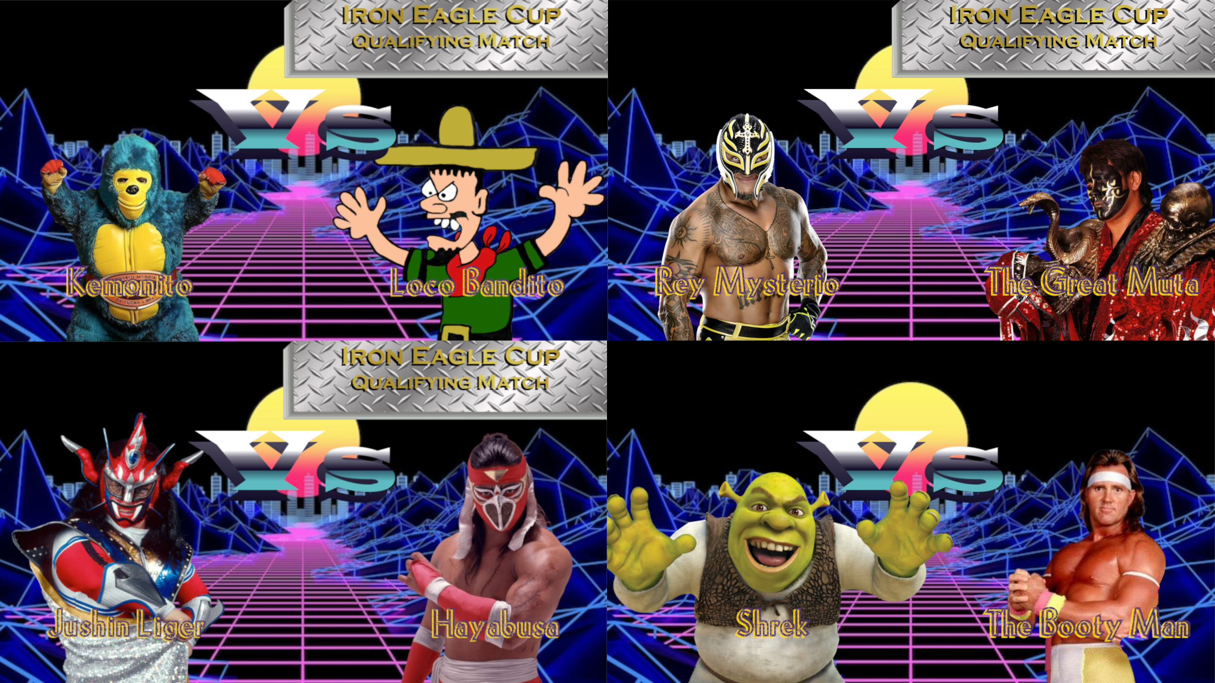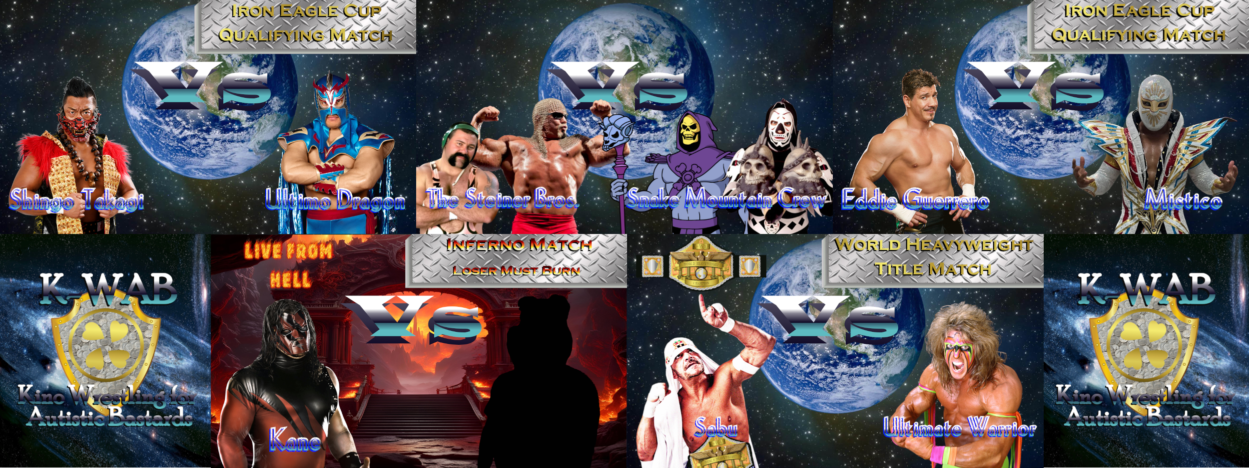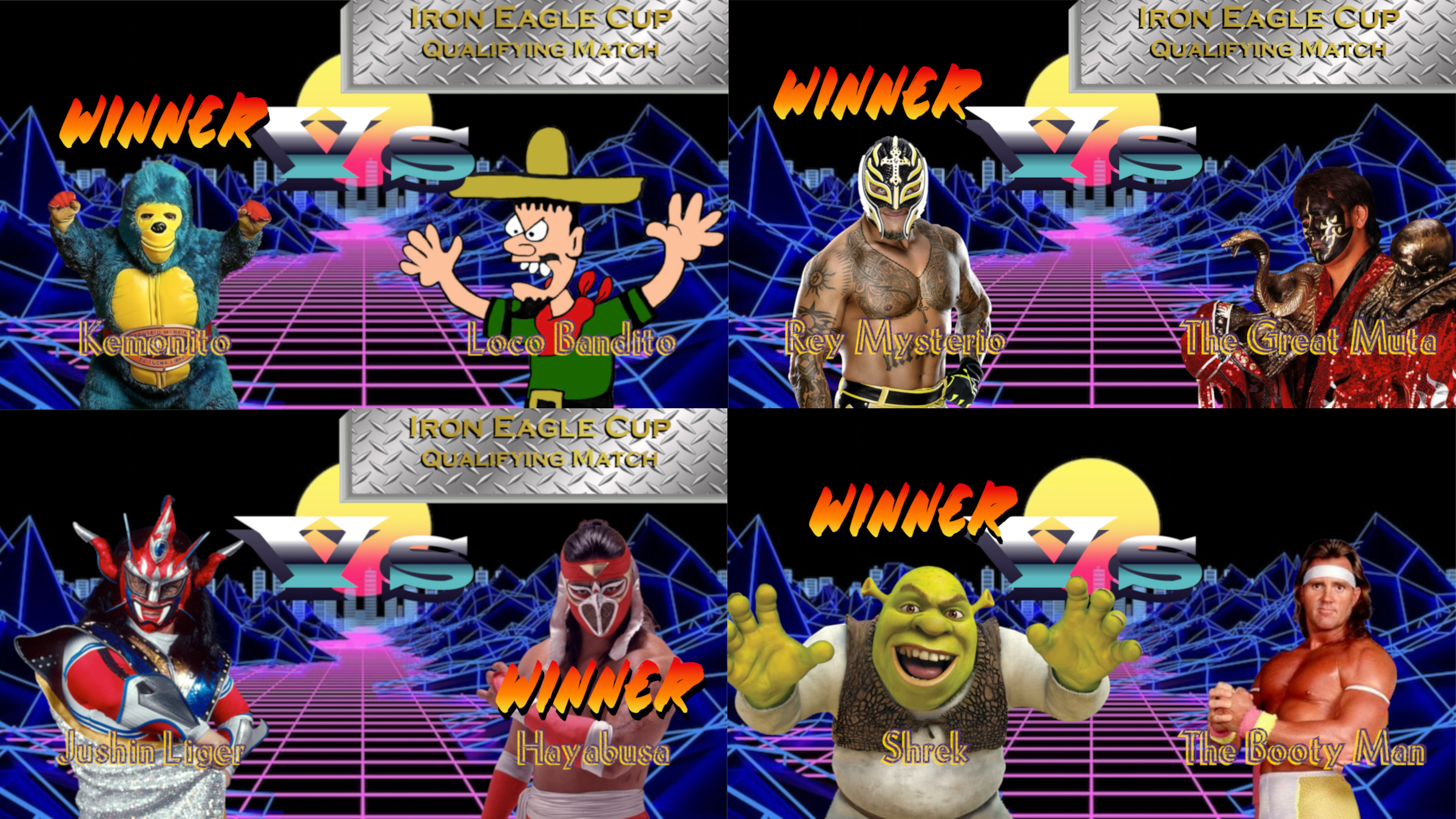 As you can see, our main focus this week is the Iron Eagle Cup, which is a tournament to determine who will be the first-ever K-WAB Cruiserweight Champion. There are ten competitors in the tournament, but five of them will be eliminated via qualifying matches and we have three of them this week. The other two will take place next week on Saturday Night Metal. For tonight though, we got four great matchups for you, including the debut of the big green machine, Shrek! I put him up against the cringiest jobber we got, so the results should be amusing. And don't forget to drop your match suggestions in this thread because the fifth match will be booked by you, the fans.