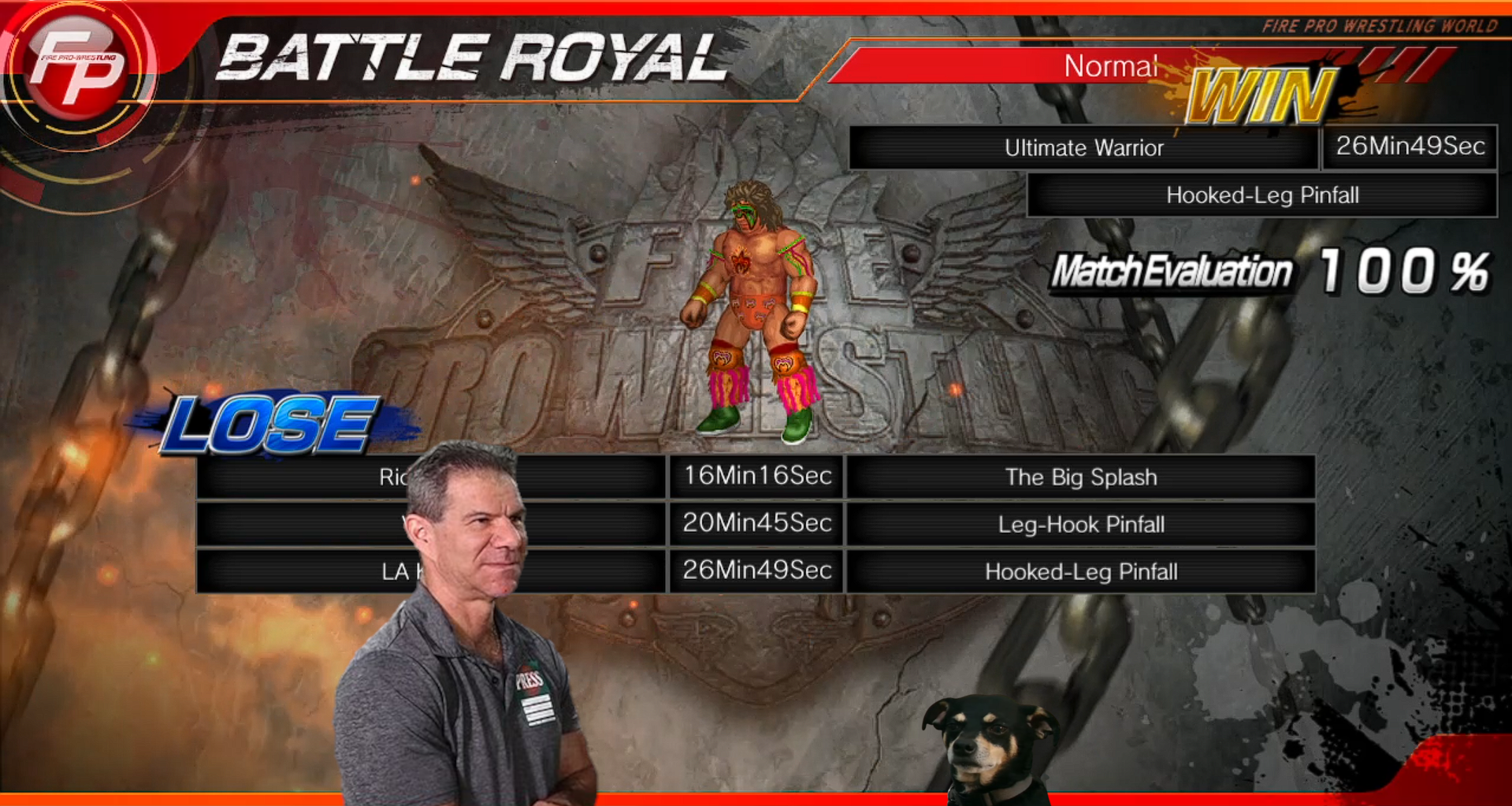 uhhhh yeah I just absolutely loved this one even though I kinda um you know...hate the warrior. It was just such a big chaotic mix and I like that kind of thing, it like, reminds me of those huge chaotic tag matches that uhhhhh Gedo books all the time. So yeah, my dog also uhh loved this match, at least ummmm I think he did. you know, he kind of uhhh pissed all over the floor when he saw Vader and uhhh that like usually means he, you know, likes something.