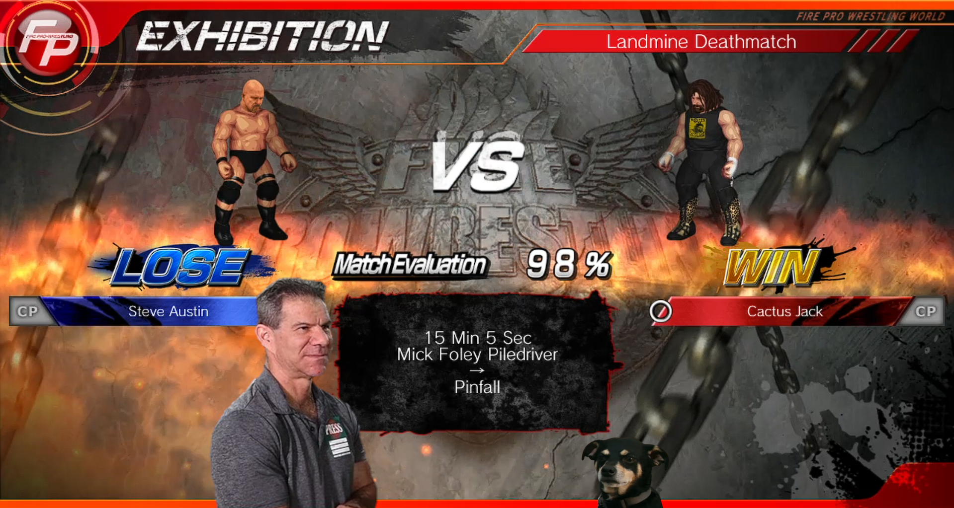 Last Sunday, Cactus Jack and Steve Austin went at it in a brutal exploding warzone deathmatch. Explosives inside the ring, explosives outside the ring, and it was a damn massacre in there. I thought Austin had him with that stunner on the exploding board, but Foley somehow managed to survive all that and score a huge win for himself, using the combination of a piledriver, an explosion, and a well-placed light tube to finally put Stone Cold away. This match was honestly added at the last minute, but it came out great all the same, and that's why we have scheduled a rematch between these two in the near future.https://www.bitchute.com/video/frVNyIIQSUuF