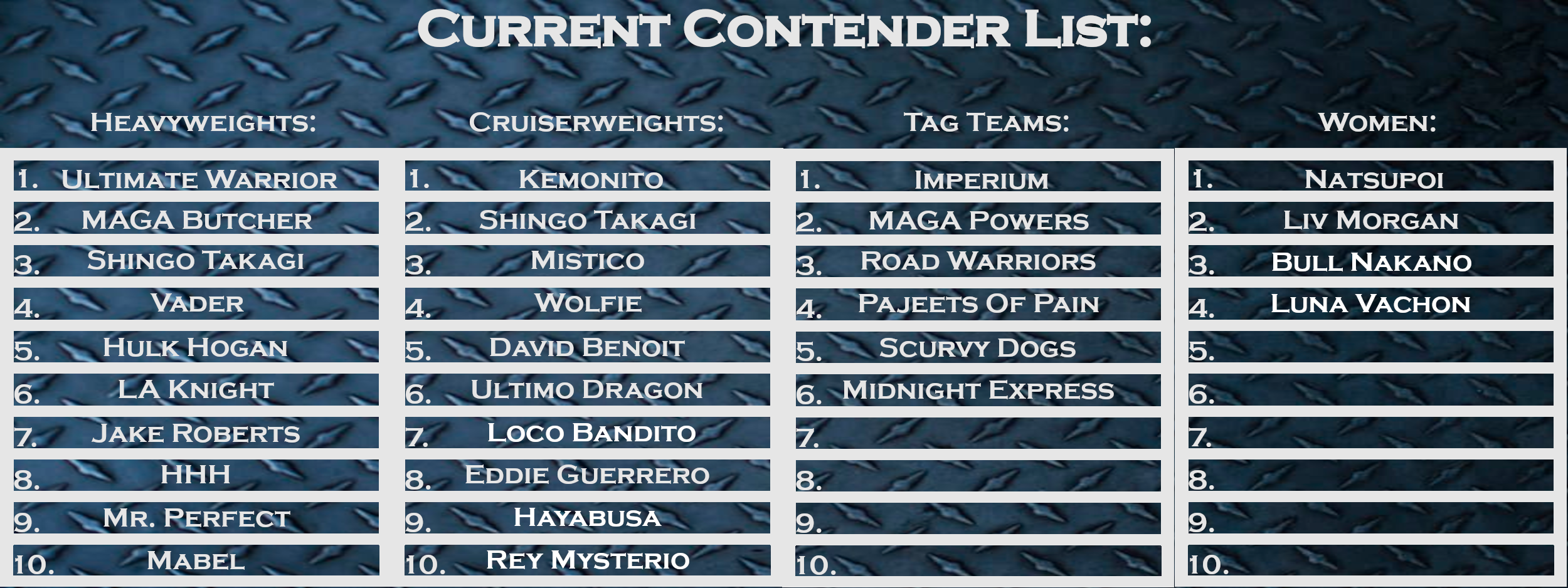 For the first time, we would like to give everyone a look at the complete contender list. Bear in mind that tonight's results have not yet been added. In this pic, you can see the top ten in each category. Here are the others:Heavyweight:>11. Harambe>12. Brody King>13. David Benoit>14. Cactus Jack>15. Kane>16. Ric Flair>17. Terry Funk>18. Mr. Perfect>19. Captain Confederate>20. Steve Austin>21. Steven Regal>22. Randy Savage>23. Sting>24. Mike Aweoms>25. Antonio Inoki>26. Rick Rude>27. RybackThe other divisions have not yet exceeded ten competitors so now you know the complete rankings. Bear in mind that some of these people are ranked a little higher or lower than they should be due to early wins or early losses.