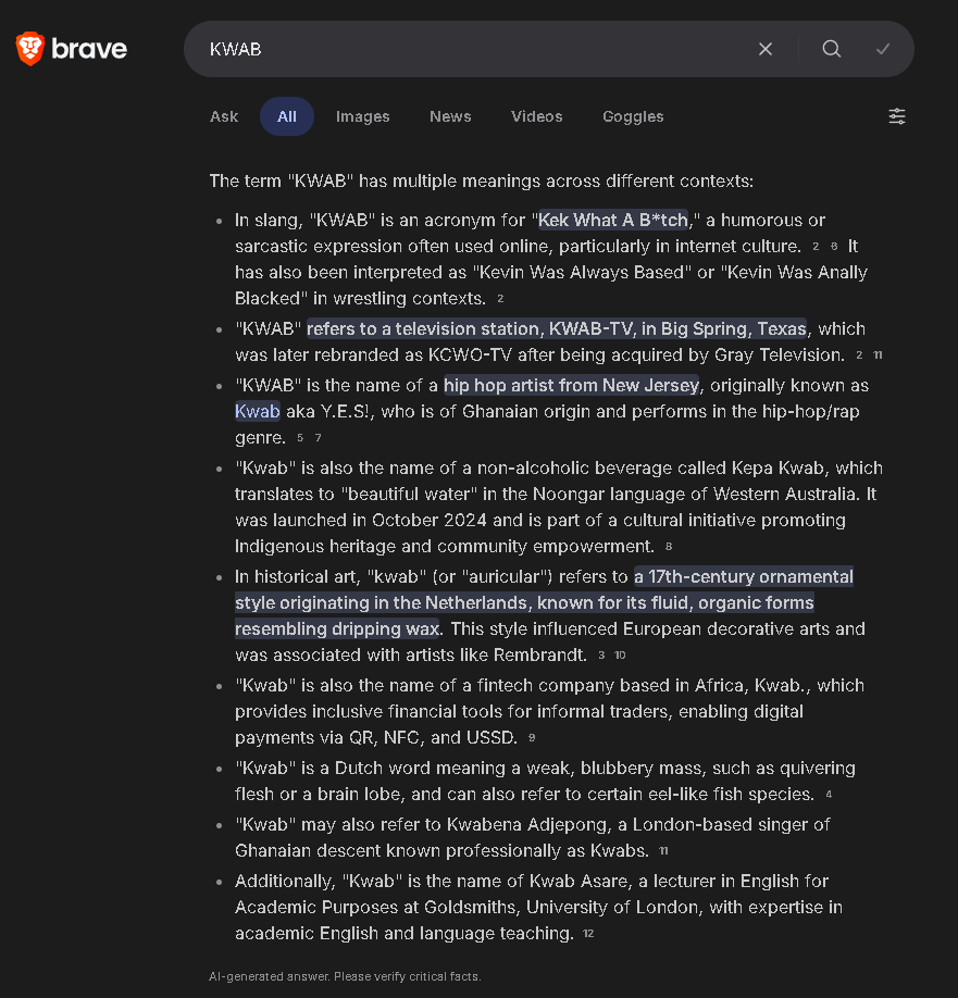 i was just curious if duckduckgo's AI knew anything about the term KWAB. this is what it shat out. lol this ai is a total newfag, it doesn't even know what KWAB means.