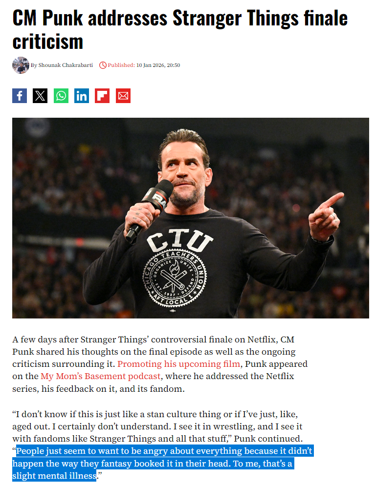 He's saying people who complain about Stranger Things, pro wrestling, etc... are slightly mentally ill, which part am I getting wrong?