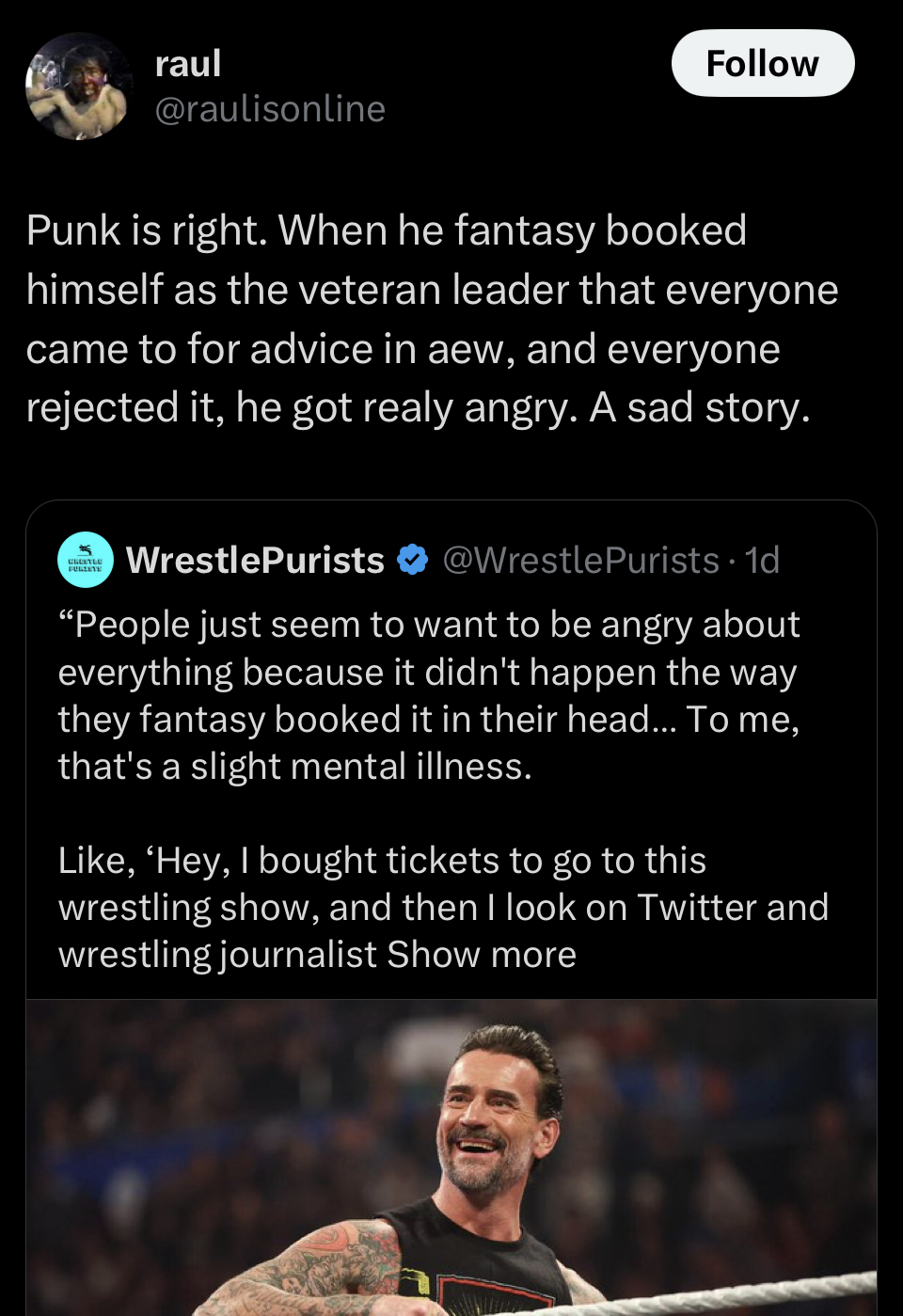 On Colts podcast he said "If you don't think I can draw money then let me go and I'll go draw money elsewhere" where he then popped a single UFC buy rate, and fumbled for 3 years before trying to get back in to WWE on that Fox panel show then joining AEW when they were organically growing anyway. Punk isn't a draw.