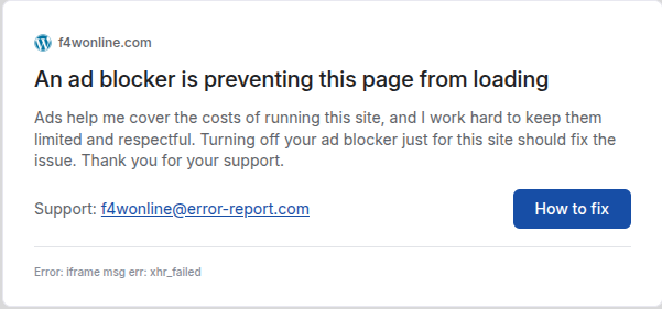 AdBlock/uBlock/uBlock LiteLooks like Bryan is getting really desperate. Seems to have happened in the past few days.Making his poor fans see popups and slowing down their pc's. F4W will probably be dead within this year.