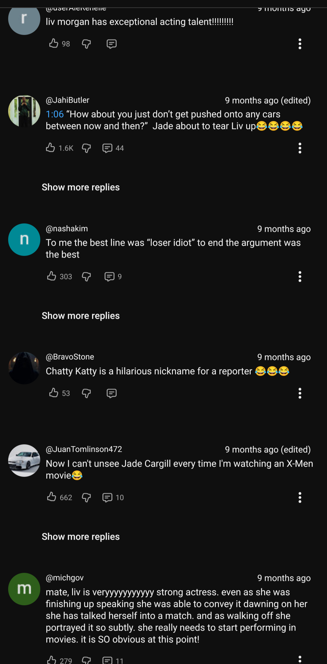 >>19685328>bro liv gets so many social media views!>did you see how many people watched this insta clip of liv?>this tiktok of liv got double the views of this one of iyo!>liv gets a million views per twitter post who cares if the crowd makes no noise when she's on the show>oh uhhhh youtube comments, lol who cares about that shitworst fanbase in wrestling