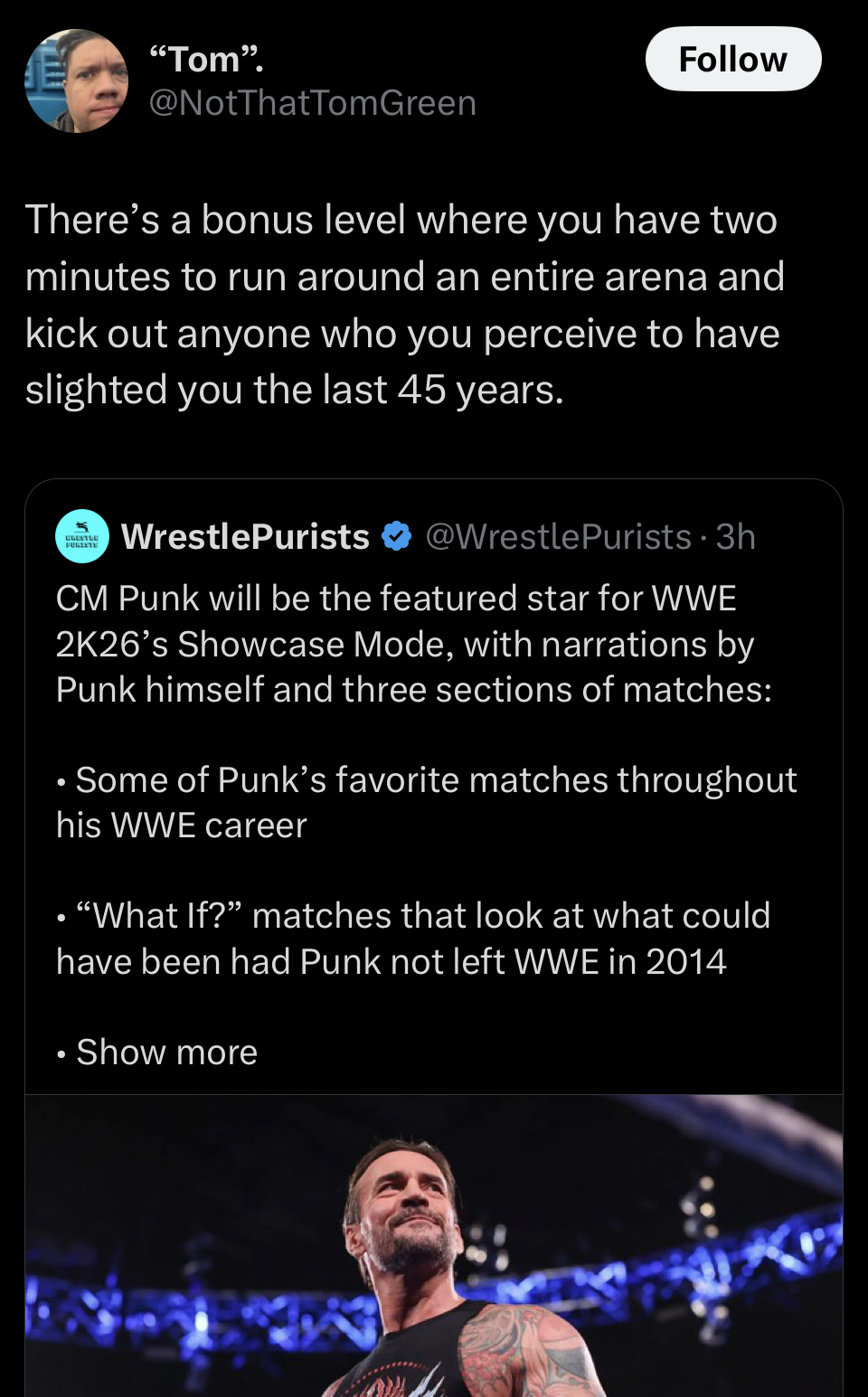 >Most of Punk's notable matches can't happen as the guys aren't in the company>Have to resort to this lame what if shit to make it workIf they do custom promo packages it might salvage it. Then again showcase mode is pretty ass anyway because its very rigid in what it wants you to do.