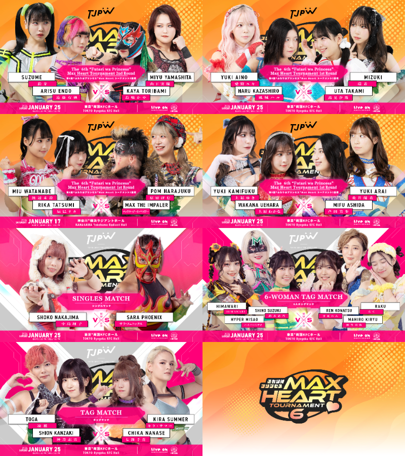 Watch on Wrestle Universe - 1,298 yen per month.https://www.wrestle-universe.com/enSchedule1.25 The 6th "Futari wa Princess" Max Heart Tournament @ Ryogoku KFC Hall, Tokyo (LIVE)[16:00 JST]1.31 The 6th "Futari wa Princess" Max Heart Tournament @ Shinjuku FACE, Tokyo (LIVE)[11:00 JST]Previous>>19699837