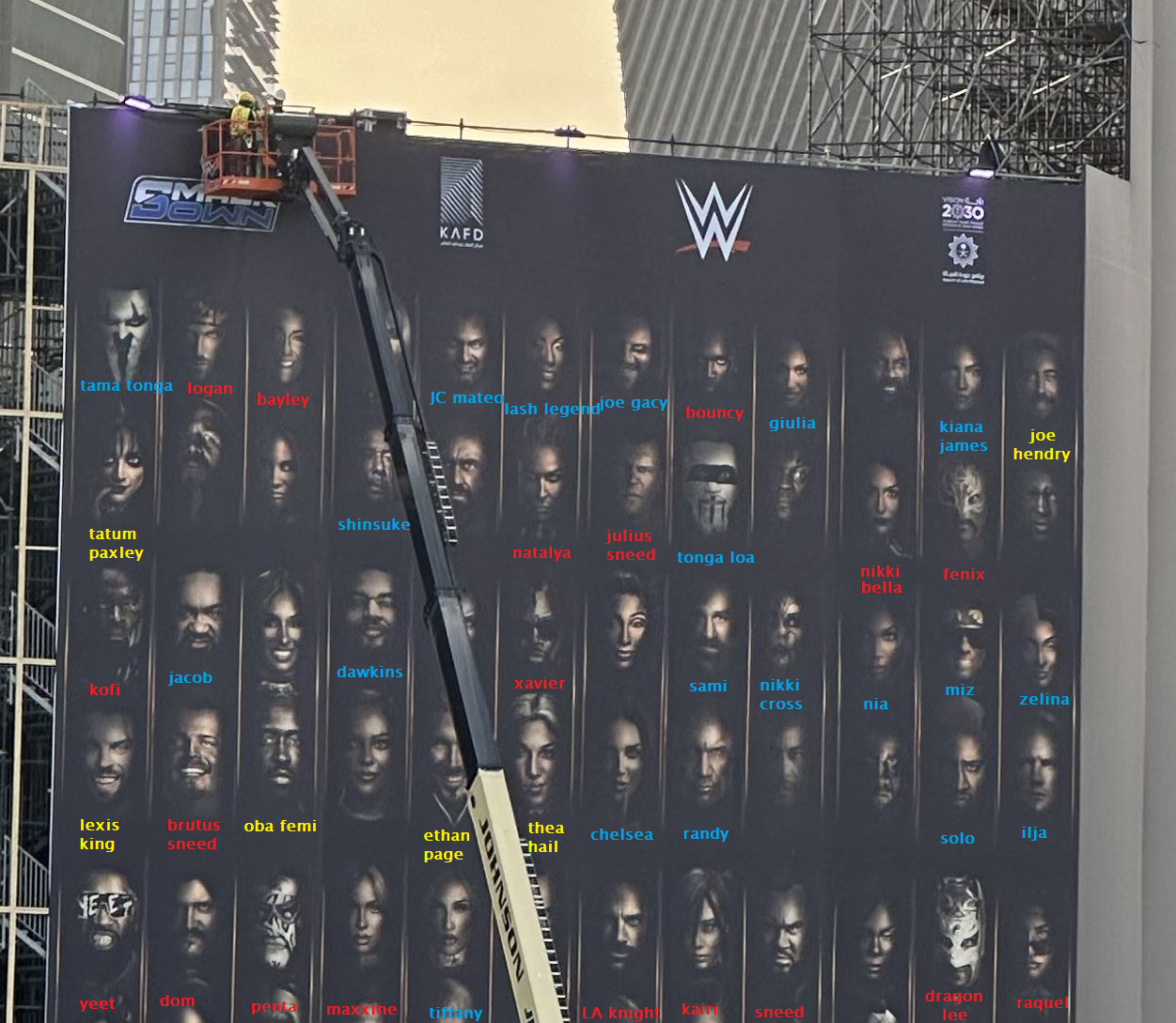 >>19710660Under Logan Paul is Erick RowanUnder Bayley is no clue. Looks like Chelsea but she's farther downUnder JC is Breakker?Under Giulia is TruthAbove Nikki is Jimmy Uso?Under Hendry is OmosIs that Lexis King or Austin Theory? Thought the latter but now I do see Lexis as wellAbove Oba is Becky maybe? Doesn't really look like herUnder Dawkins I'm not sure. Maybe Roxanne?Above Chelsea is CharlotteUnder Nikki Cross is Roman?Under Nia is LumisTo the right of Bronson is B-Fab I think