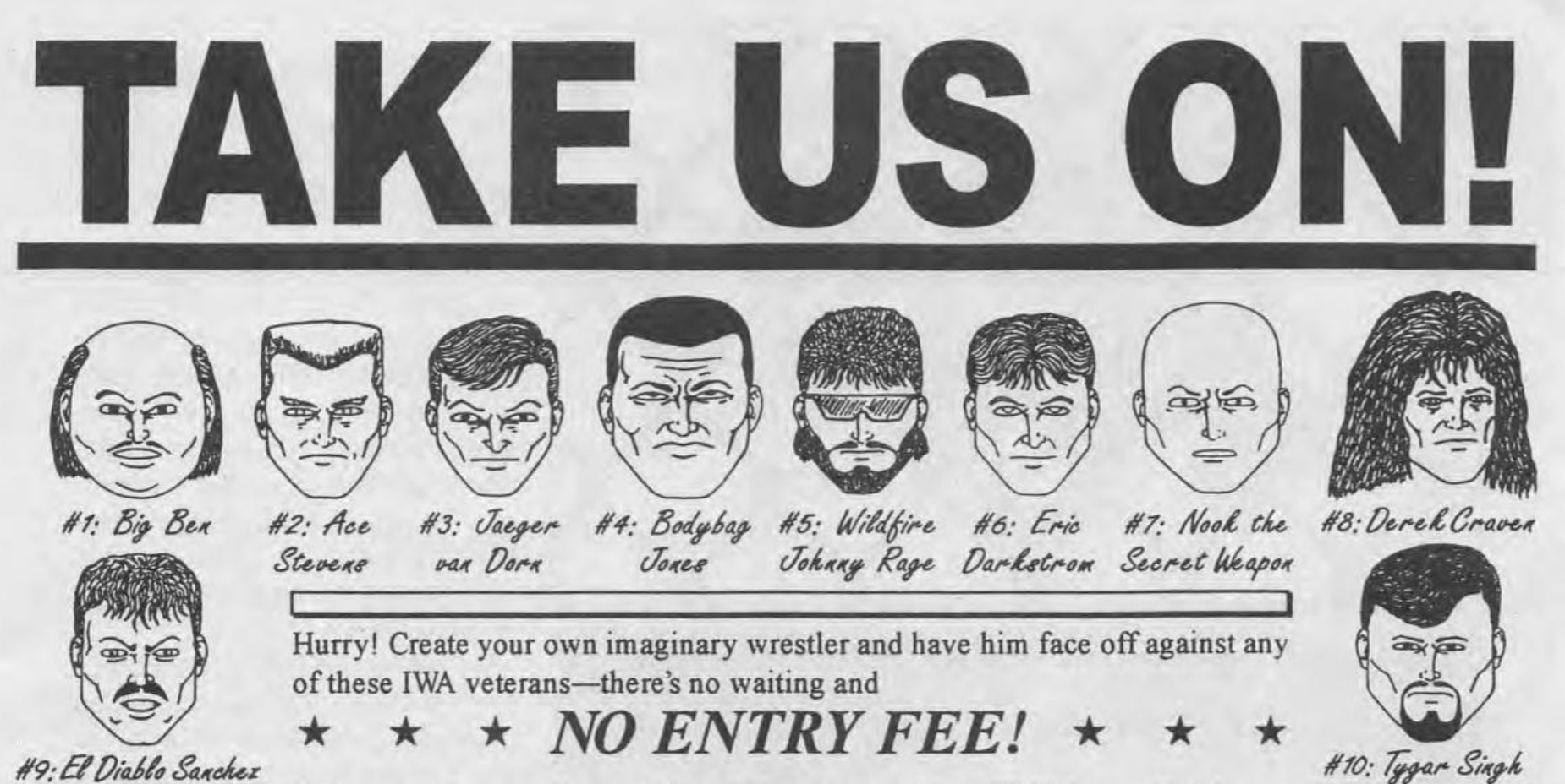 >>197203361. Fat Mean Gene2. Wrestling Guile (Not Cody)3. Evil Conan O'Brian (My favorite)4. Kozlov5. California Giant Gonzalez6. Handsom Tom Zink7. The current face of America8 Pre-facepaint Ultimate Warrior9. Eddie Guerrero if he lived 10. the future face of America