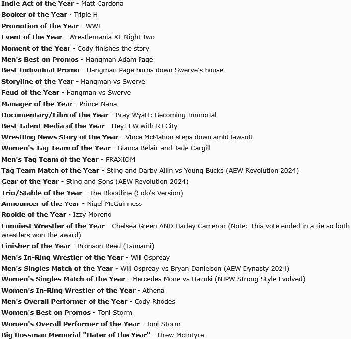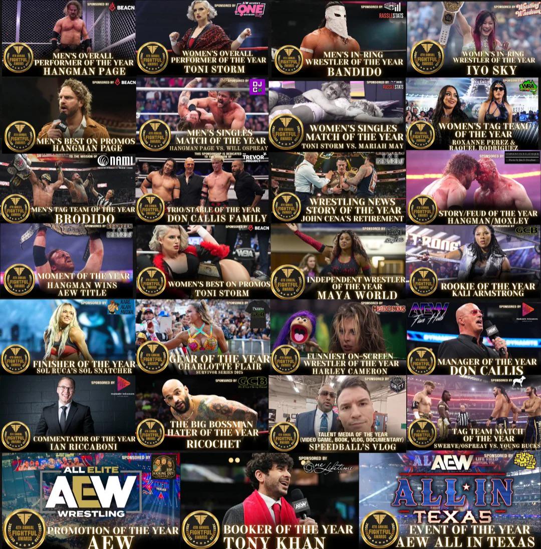 >MEN'S OVERALL PERFORMER OF THE YEARHANGMAN ADAM PAGE>WOMEN'S OVERALL PERFORMER OF THE YEARTONI STORM>MEN'S IN-RING WRESTLER OF THE YEARBANDIDO>WOMEN'S IN-RING WRESTLER OF THE YEARIYO SKY>MEN'S BEST ON PROMOSHANGMAN ADAM PAGE>MEN'S SINGLES MATCH OF THE YEAR - HANGMAN ADAM PAGE VS WILL OSPREAY @ DOUBLE OR NOTHING>WOMEN'S SINGLES MATCH OF THE YEARTONI STORM VS MARIAH MAY @ REVOLUTION>WOMEN'S TAG TEAM OF THE YEARROXANNE PEREZ & RAQUEL RODRIGUEZ (THE JUDGMENT DAY)>MEN'S TAG TEAM OF THE YEARBRODY KING AND BANDIDO (BRODIDO)>TRIO/STABLE OF THE YEARDON CALLIS FAMILY>WRESTLING NEWS STORY OF THE YEARJOHN CENA'S RETIREMENT>STORY/FEUD OF THE YEARHANGMAN ADAM PAGE VS JON MOXLEY>MOMENT OF THE YEARHANGMAN ADAM PAGE WINS THE AEW TITLE>WOMEN'S BEST ON PROMOSTONI STORM>INDEPENDENT WRESTLER OF THE YEARMAYA WORLD>ROOKIE OF THE YEARKALI ARMSTRONG>FINISHER OF THE YEARSOL RUCA'S SOL SNATCHER>GEAR OF THE YEARCHARLOTTE FLAIR @ SURVIVOR SERIES>FUNNIEST ON-SCREEN WRESTLER OF THE YEARHARLEY CAMERON>MANAGER OF THE YEARDON CALLIS>COMMENTATOR OF THE YEARIAN RICCABONI>THE BIG BOSSMAN HATER OF THE YEARRICOCHET>TALENT MEDIA OF THE YEARSPEEDBALL MIKE BAILEY'S VLOG>TAG TEAM MATCH OF THE YEARWILL OSPREAY AND SWERVE STRICKLAND VS THE YOUNG BUCKS @ ALL IN>PROMOTION OF THE YEARAEW>BOOKER OF THE YEARTONY KHAN>EVENT OF THE YEARAEW ALL IN TEXAS 2025