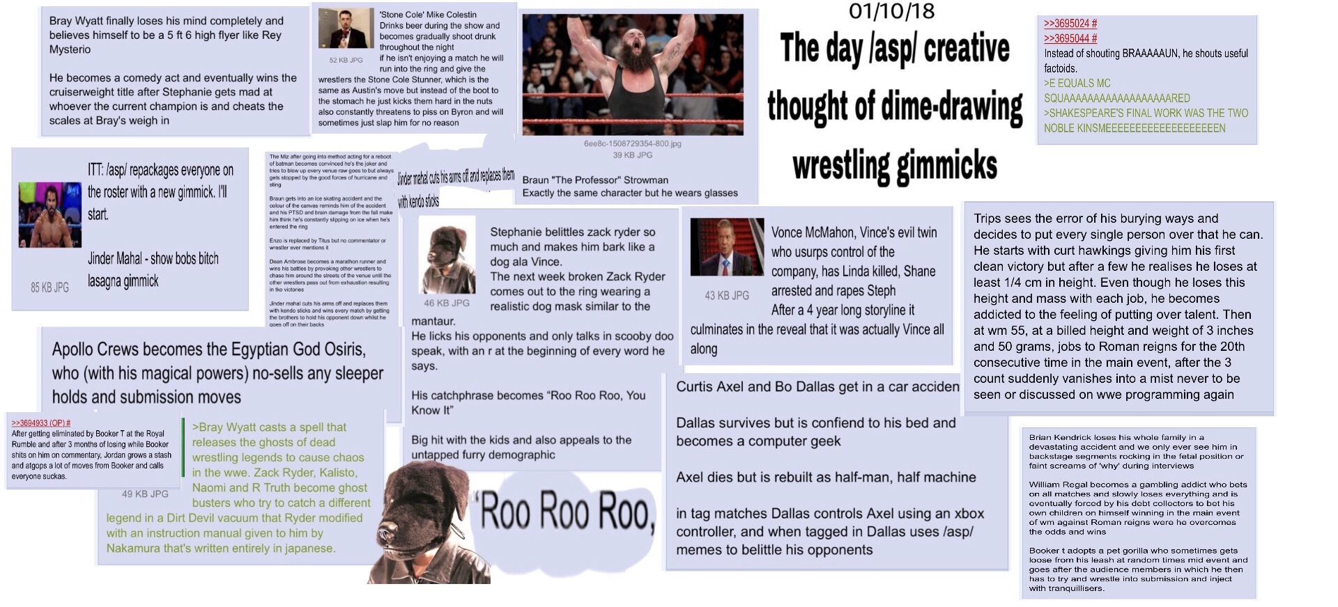 I want outlandish gimmicks.I'm tired of pro wrestling being presented as a "real" sport.Give me a guy with a wizard. Caveman gimmick, robot gimmick (big guy with his small guy mechanic tagteam partner), etc.