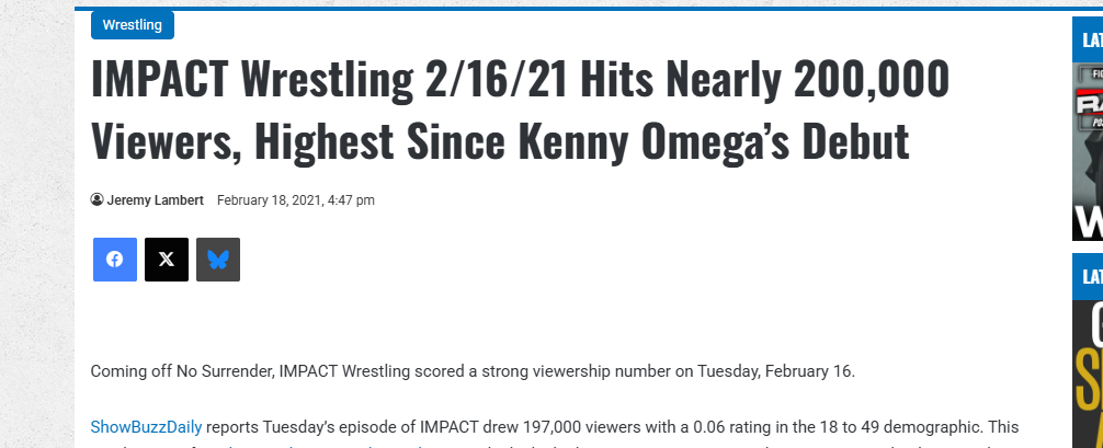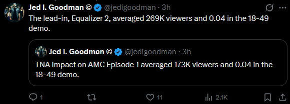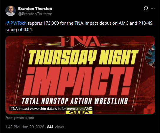 This is only a bad rating for the WWE fans who are using TNA in their weird console wars.I think the problem comes with that it was an awful show and it'll decline afterwards. But the TV was cheap, so I doubt they care. But they had a chance to put on a really solid show, gain some buzz and they just did the opposite. The WWE deal is and was an albatross, they lost a ton of talent to them in the year leading up to it, traded one of their wrestlers for an AJ Styles promo (???) instead of a match. At least AEW put their big guys on their show and got a few extra eyes for them albeit a one off.