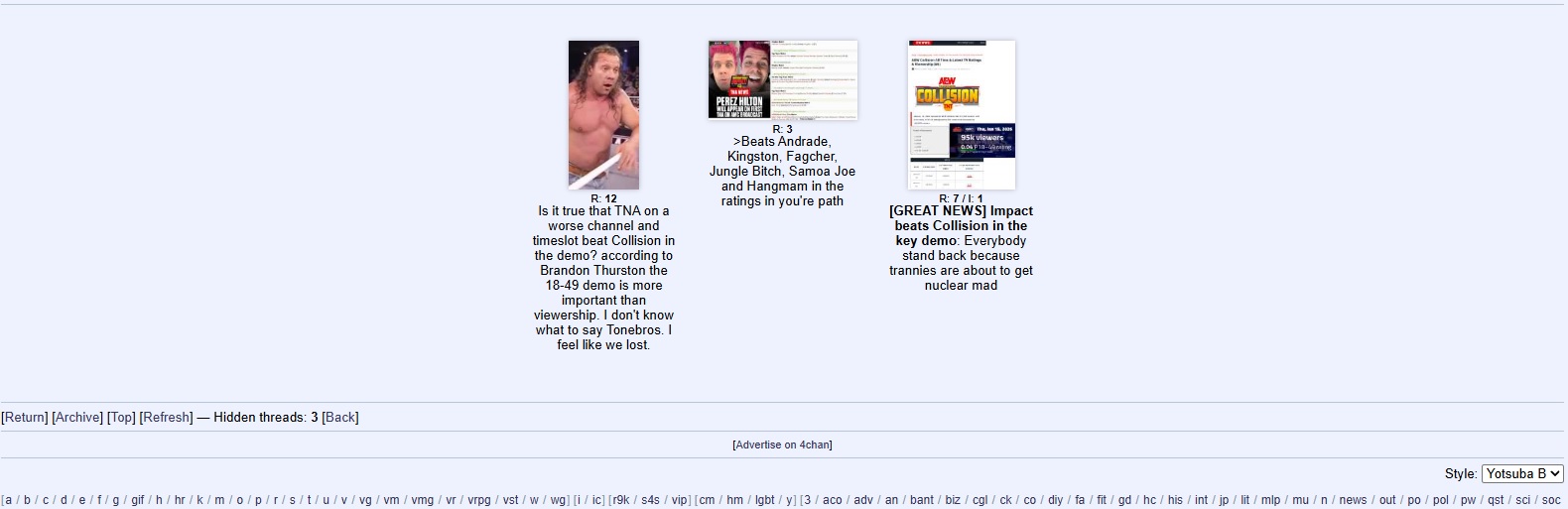 >>19723426this. anytime raw doesnt chart they already start acting derangedbut with the news that their super astroturfed “new #2” promotion did a rating THAT bad?fuck man. this boards gonna be unusable for a whole week at least