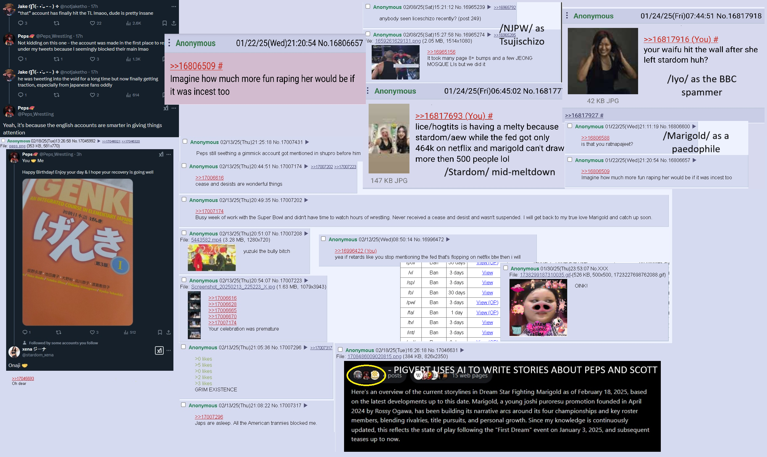 Hog, you literally stalked the Peps kid from Twitter for years dating back to when he was underage in 2022.You live in the joshi generals and stalk the social media accounts of their young wrestlers. You openly gooned to Hanan, Rina, and Hina when they were literal children.You had an "incest rape fantasy" for Azusa Inaba.And you've obsessed over the Izzy kid from NXT since you saw her sit on that obese WON neckbeard's lap and wished it was you.