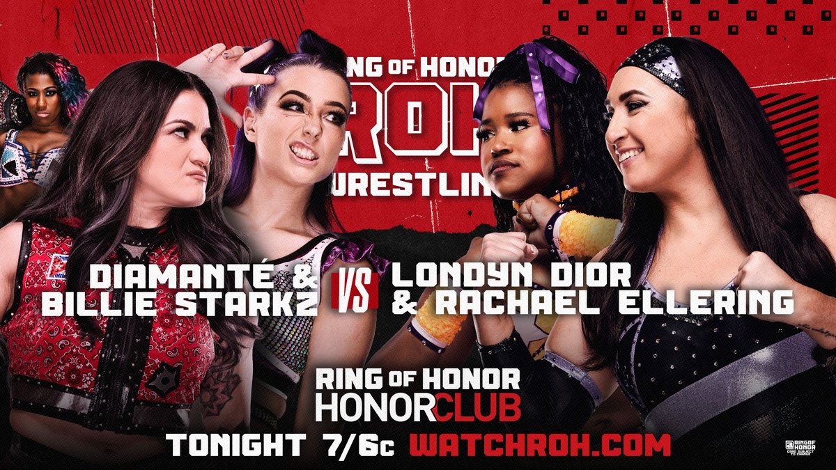 Tonight at 7 ET>Dalton Castle & The Outrunners (Truth Magnum & Turbo Floyd) vs. TBA>Satnam Singh vs. TBA>Johnny TV (w/Taya Valkyrie) vs. Ace Austin>Adam Priest & Tommy Billington vs. The Premier Athletes (Ariya Daivari & Tony Nese) (w/Mark Sterling & Stori Denali)>Londyn Dior & Rachael Ellering vs. MIT (Billie Starkz & Diamante)>Alec Price & Jordan Oliver vs. CRU (Action Andretti & Lio Rush)>KM & Will Allday vs. Big Bill & Bryan Keith>ROH Pure Title Proving Ground Match: Lee Moriarty vs. Matt Menard