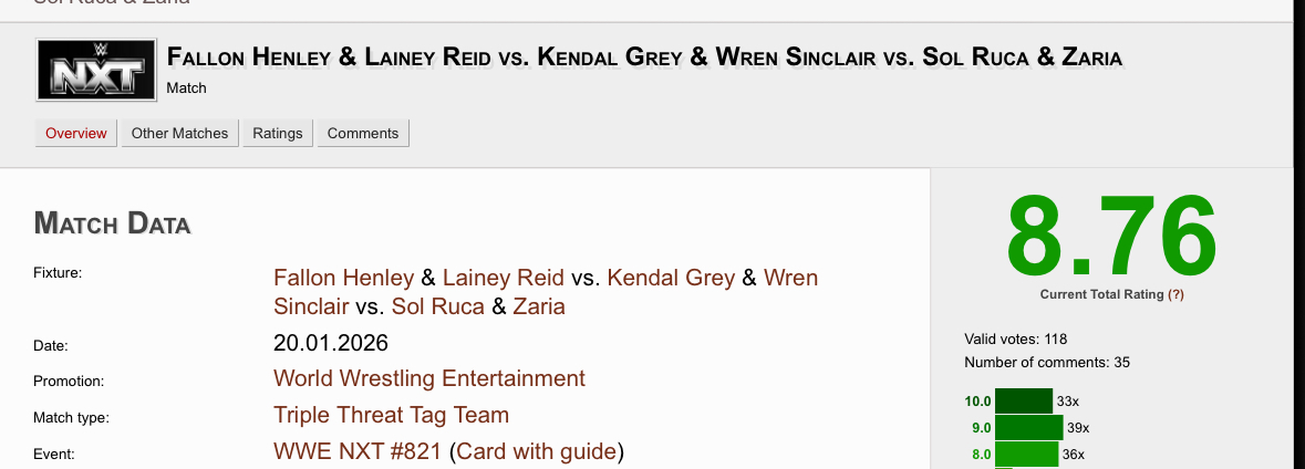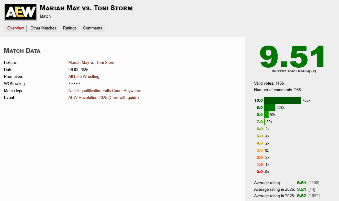 >>19738634>cagematch has a simp colony on it, most chickslop gets overrated. not really a wwe vs aew thing.You're right, cagematch, and /pw/, have Simpsons, but if you think cagematch specifically only ever blindly praises women's matches, you are laughably out of touch.A lot of the same women that were in this week's 3-way tag match were also in poorly-rated matches by cagematch's so-called "simp" brigade/colony.I know you've seen the low ratings before, along with the high ones you called out. Why do you act like the low ones don't exist?