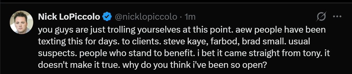 >>19746094idk man it does seem strange that an army of bots and shills brigaded him in concert with getting contacted by both Shad Khan's general counsel and C-level mgt. at AEWThis sounds more to me like a financial settlement was reached to pay for LoPiccolo's next few pet projets. We'll have to see. Very telling is that the usual army of bots and shills aren't blowing him up on X about this. Almost like they've been told to knock it off (or more to the point, NOT told to act) Just my speculation of course