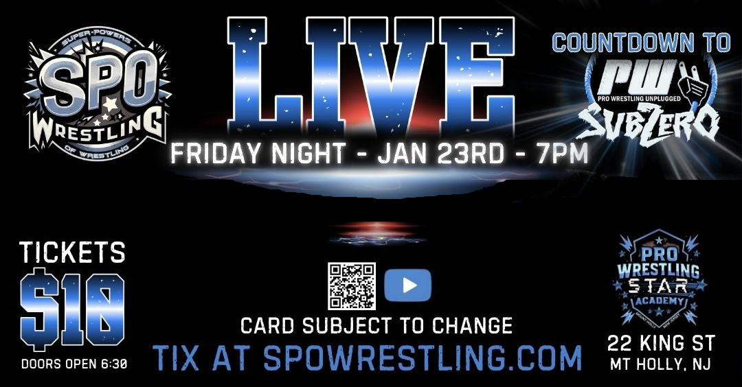 Venue: Pro Wrestling Star AcademyCity: Mount Holly, New Jersey, USAVideo link coming soonStart at 7 PM EST on YouTube>Becca Wiley vs. Tiphani Grady>Alex Rivera (c) vs. Twitch for the SPO Championship>Ryan O'Neill vs. John Underwood>Hyena Hexx vs. James Gray>Malik Makaveli vs. JGeorge