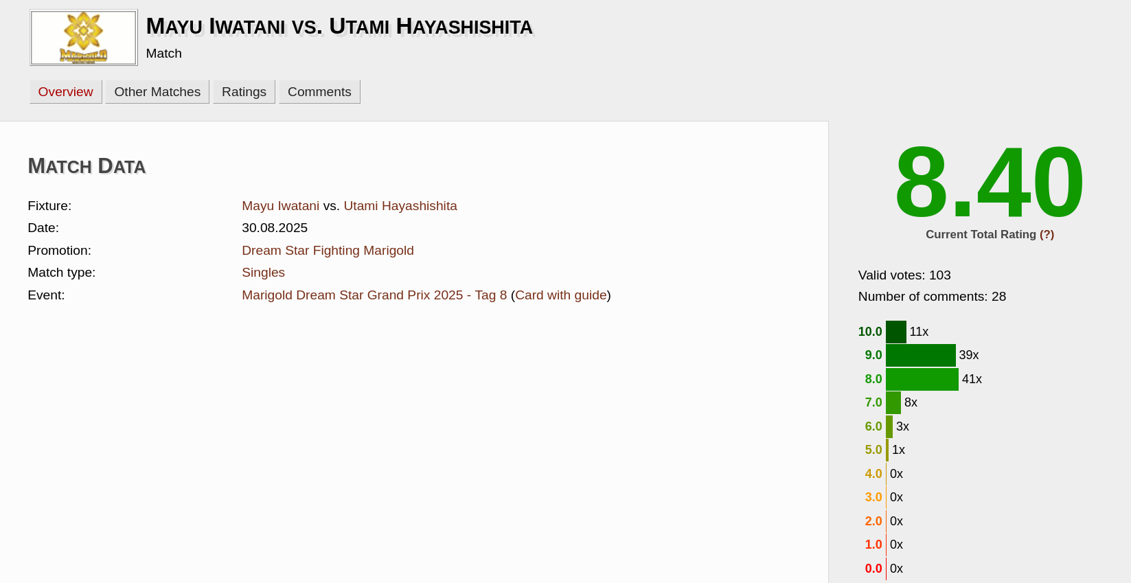 Here are my raw thoughts after watching the show. No assist from ChatGPT. Mayu Iwatani's 15th Anniversary was everything one could hope for. A fantastic ceremony that helped celebrate her past, followed by a match with Utami Hayashishita that plays to all of her greatest hits, some silliness mixed in, and a closing that saw her do everything in her power to allow those around her to take part -- putting Marigold on her back for that very moment.Everything about the celebration was a wonderful, wonderful way of kicking Marigold into full force for 2026 -- with her and Utami leading by example with a big time main event on a big time show.I couldn't ask for much more from it all, and I think Mayu has already proven this month alone that 2026 is going to be one of the most special years of her entire career.So for one final time, Happy Anniversary Icon!The Greatest of All Time.