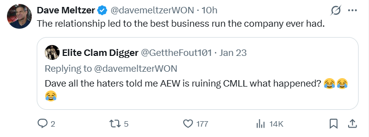 >>19757177>AEW's partnership with CMLL has lead to CMLL's business booming in mexico and AEW fucking dying in AmericaCMLL must be laughing so hard at that autistic gay gringo and his rich dad