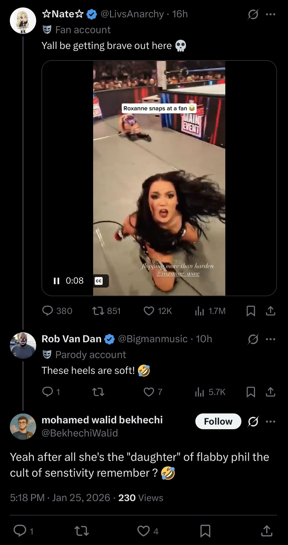 dronies are so parasocial that you cant say mean things to wrestlers https://x.com/LivsAnarchy/status/2015450253307072522