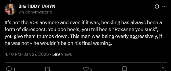 In the 80’s and 90’s people threw popcorn and drinks at heels who had major heat, nerds todsy would have been shocked to see that from fans if they’re complaining about this guy. I love that Roxanne stood up for herself and told dude to shut the f up, that’s exactly what she should do as a heel. As long as fans aren’t trying to hit or hurt the wrestlers it should be all good and fun, it’s wrestling.