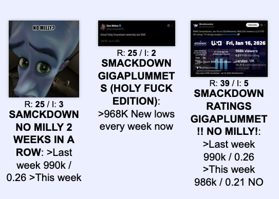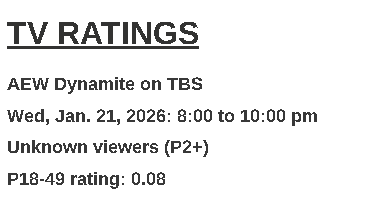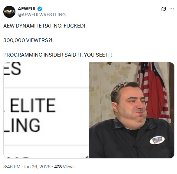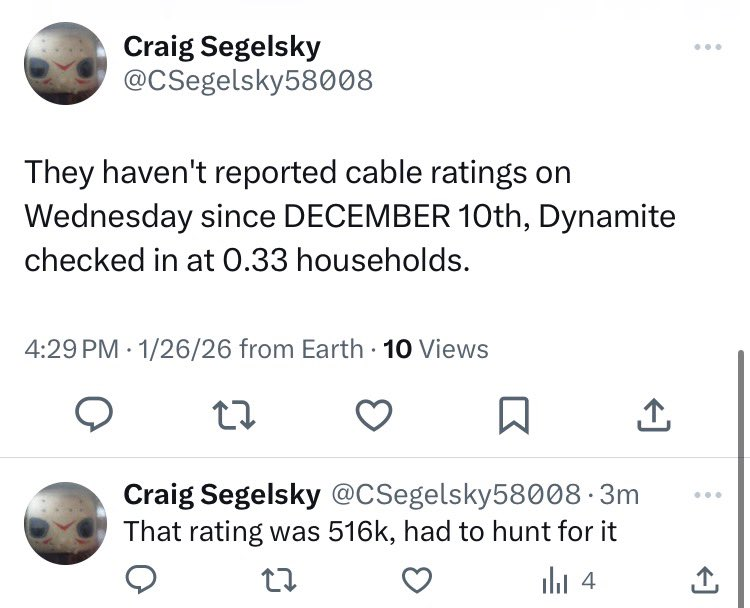 >>19772447Not to mention >>19770584>On December 10th 2025, Dynamite did a 0.33 household rating, which translated to 516k overall viewers. >So this number will be somewhere around 500k at a 0.30 household rating.The number will be somewhere around 500k based on the household rating reported so far