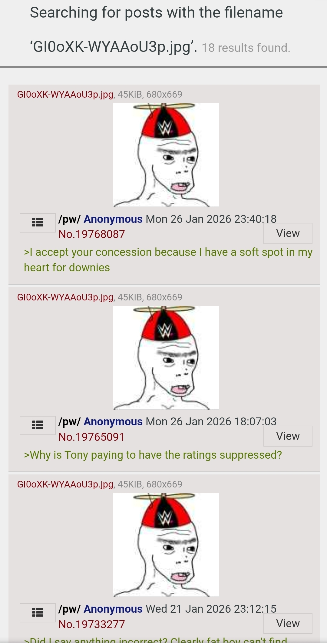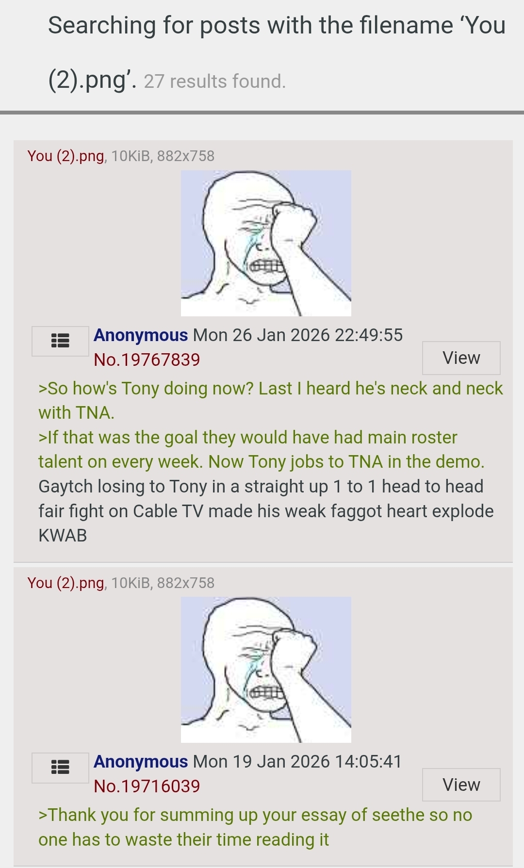 >>19770898>I didn't read any of that OK I'll repost it then;You're the one still fiending like a junkie for the Dec 24th Dynamite rating because it was never released. You've made a thread about it almost everyday since Christmas and we are now 27 days into the New Year and you are still OBSESSING over it.Crackhead behaviour