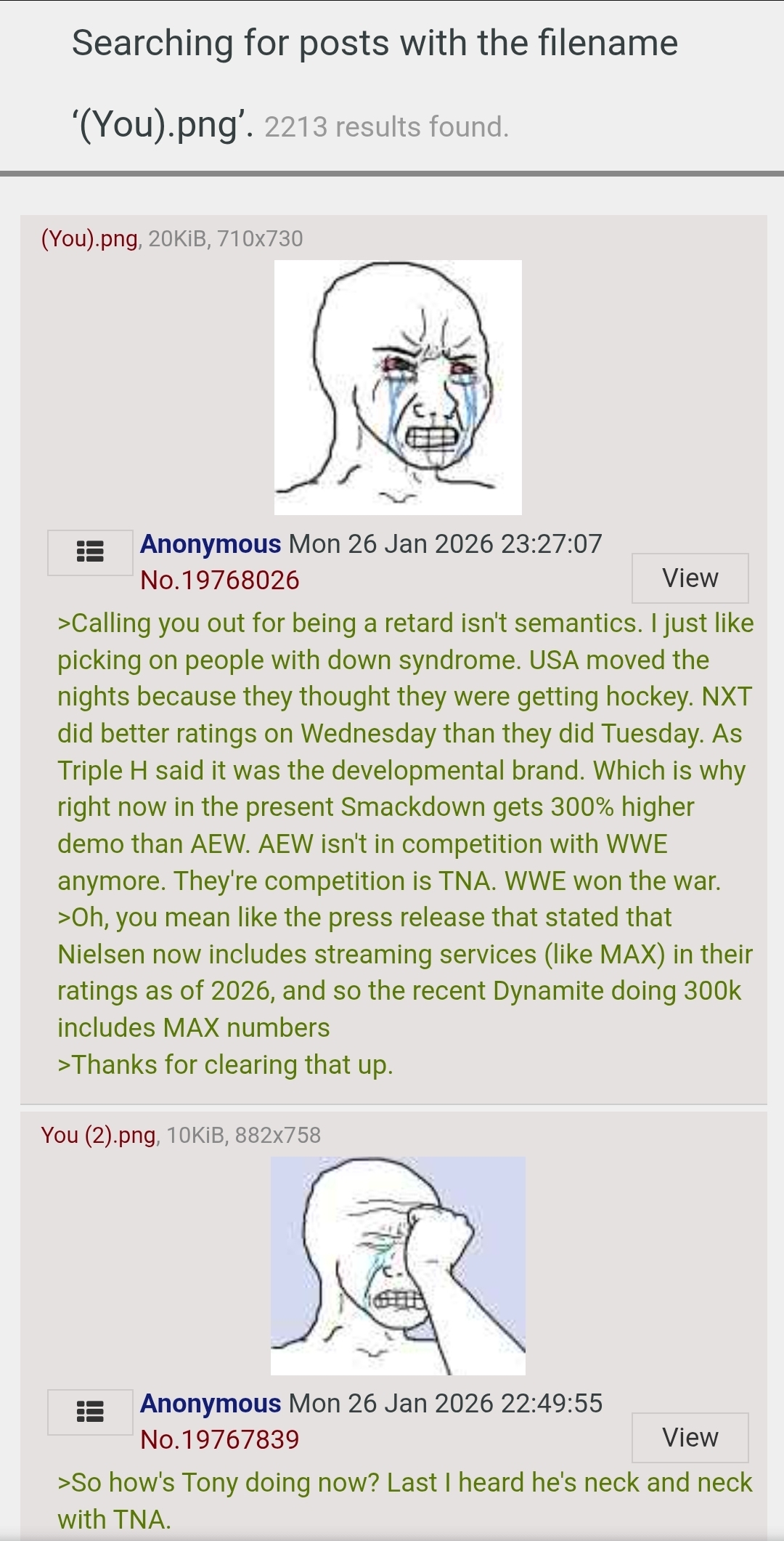 >Calling you out for being a retard isn't semantics. I just like picking on people with down syndrome. USA moved the nights because they thought they were getting hockey. NXT did better ratings on Wednesday than they did Tuesday. As Triple H said it was the developmental brand. Which is why right now in the present Smackdown gets 300% higher demo than AEW. AEW isn't in competition with WWE anymore. They're competition is TNA. WWE won the war.>Oh, you mean like the press release that stated that Nielsen now includes streaming services (like MAX) in their ratings as of 2026, and so the recent Dynamite doing 300k includes MAX numbers>Thanks for clearing that up.