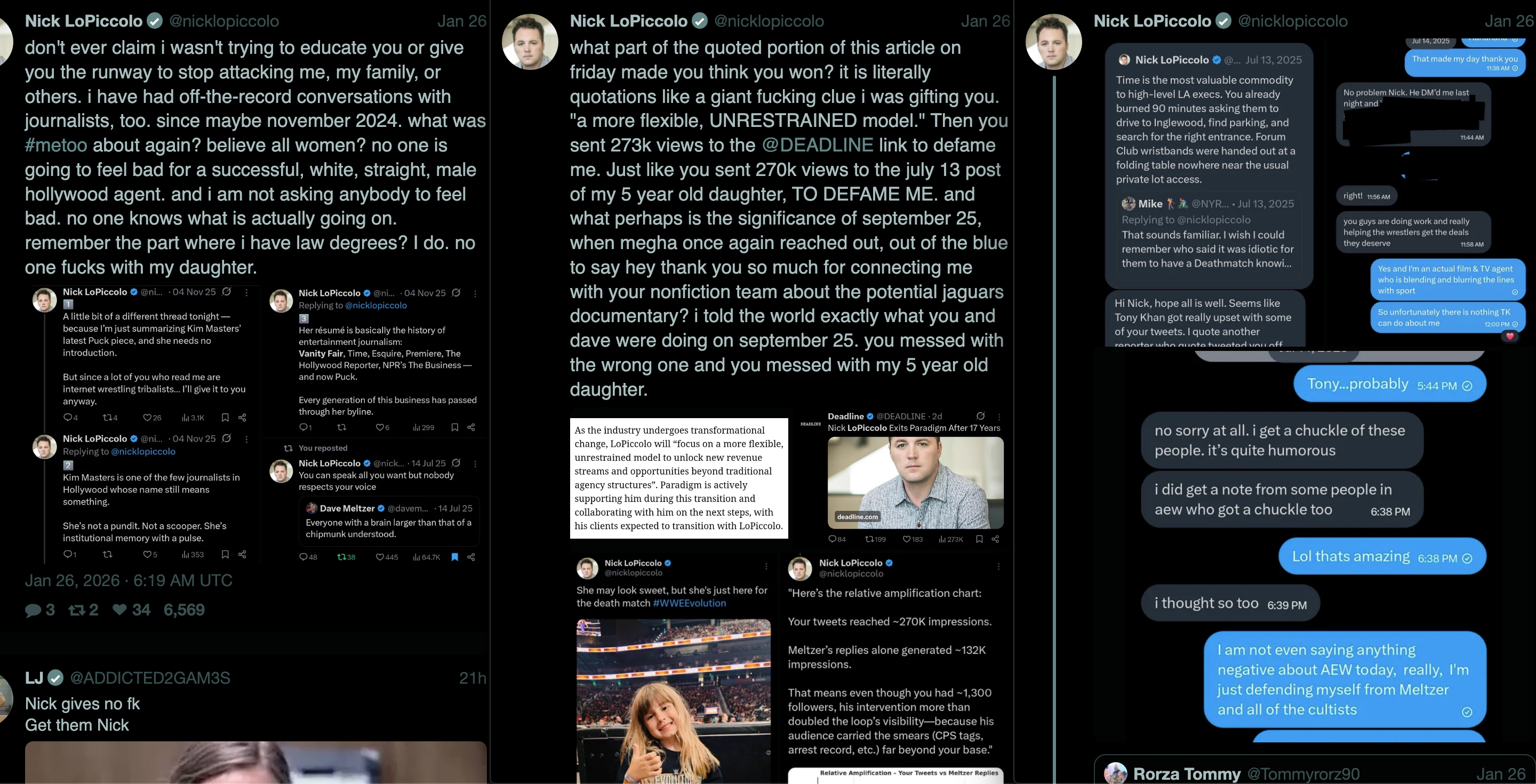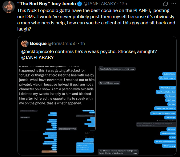 >>19773747Lil Nicky TL;DR for future reference>Complete unknown until he goes slightly viral for flipping off Becky after she beats Liv for the tag titles at Wrestlemania>People look into him a little bit and realize he is absolutely obsessed with Liv, much more than any normal guy who's supposed to be her agent should be.>Nothing much comes from this for a few months other than jokes about how much of a simp he is>About a month later Meltzer and Alvarez talk about Mariah May (another client of Nick) going to NXT and take shots at her for it or something to that effect>Lil Nicky absolutely loses it over this, and starts down his path of schizophrenia>Spends hours almost daily coked out of his mind insulting Meltzer, Alvarez, AEW, and Tony Khan. Literally the kind of console war bullshit you'd see here.>Nick takes his daughter to the WWE Evolution PPV and posts a picture of her there while spending the entire show live tweeting about how incredible the PPV is and how AEW could never compare, or inspire and empower girls like WWE does>Shortly after this is when he begins falling completely off the rails. Nightly crashouts about Tony, Dave, and others threatening him, trying to get him fired, trying to ruin his reputation, trying to sabotage his clients, trying to have his daughter removed by protective services.>This carries on for months, until we finally hit the crescendo about a week ago, where he spends an entire night having a complete mental breakdown about Tony Khan and Dave Meltzer personally financing a troll farm to gangstalk him and ruin his life.>He privates his twitter after this and then gets fired the next day>Has been becoming increasingly schizophrenic to the point he thinks most people he interacts with now are Tony Khan, and keeps talking about the mountains of "evidence" he has that Tony Khan has been stalking him and trying to ruin his career and have his daughter taken away from him for months now