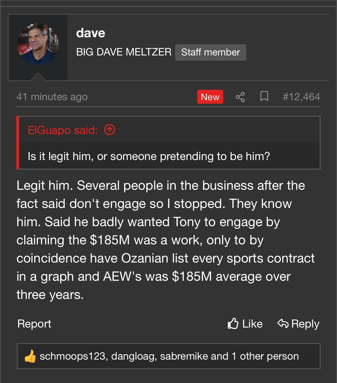 >>19774040>This carries on for months, until we finally hit the crescendo about a week ago, where he spends an entire night having a complete mental breakdown about Tony Khan and Dave Meltzer personally financing a troll farm to gangstalk him and ruin his life.This started because Tony was awarded booker of the year by fightful. That's what made him lose it.