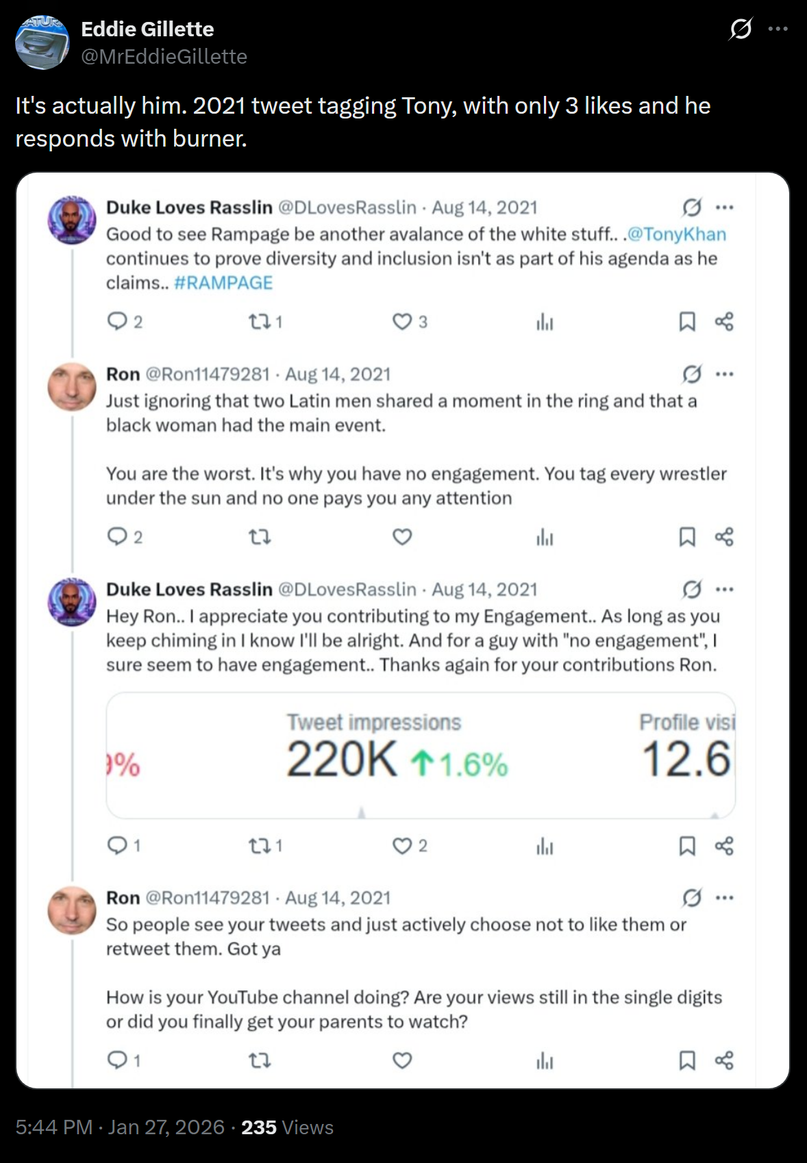 AEW trannies are mad because Nick said GayEW is going to end up on youtube after WBD doesn't renew them