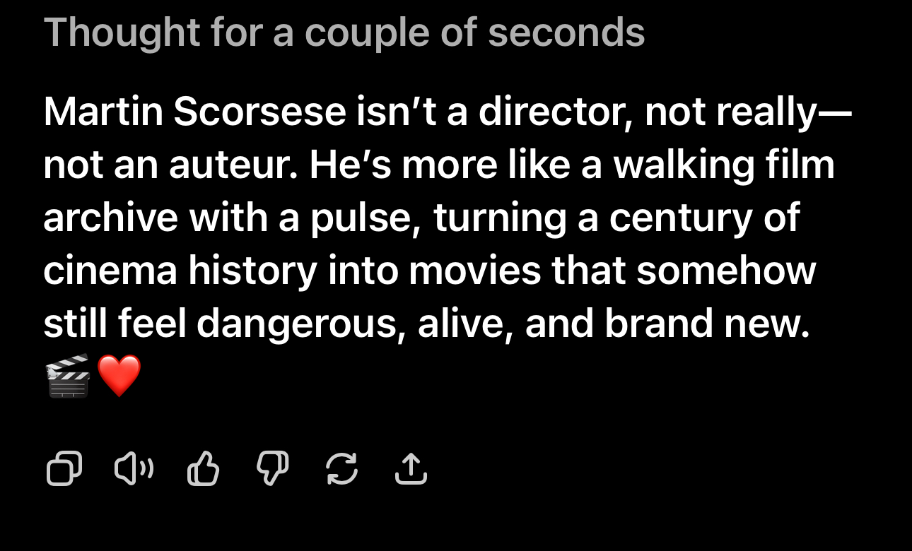 >>19773764>>19773764Yeah, maybe it’s Grok but I’ve never worked with that. But it looks almost exactly like ChatGPT. If you asked it for a short Tweet praising Martin Scorsese for example it would kick back>He’s not an Auteur >Hes not even a Director really>He’s more like a walking film archive with a pulse It literally kicked it back on the first query. If I told it to expand on that, the odds are good it would look something like his next tweet except instead of “has passed through her byline” it would list movies and then say “passed through his lens” If you ever worked with these things you can spot them quick. I’m just saying this guy Nick barely writes anything on his own from what I’ve seen. Everything has filtered through an AI.