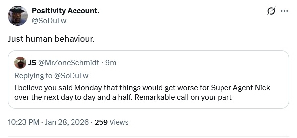 recent updates >he got fired and paid his friend for a fluff piece to sugarcoat it>got banned from twitter for telling people to commit suicide >pays for a the ban to be lifted >starts targeting random burner accounts claiming they belong to Tony Khan >says he's going to deactivate his Twitter account for the sake of his "clients">starts reposting on twitter again a a few hours later KWABOTY 2026 off to a hot start