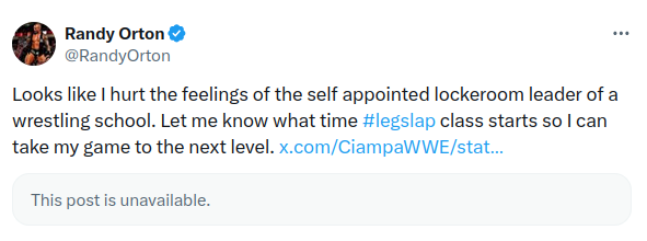 >>19781510i just looked up the context for this and it comes orton being butthurt over fans going nuts over ciampa's takeover matches lmfao, with ciampa responding that he uses orton matches to put his daughter to sleep.what a gotten to restholding boring ass bitch.
