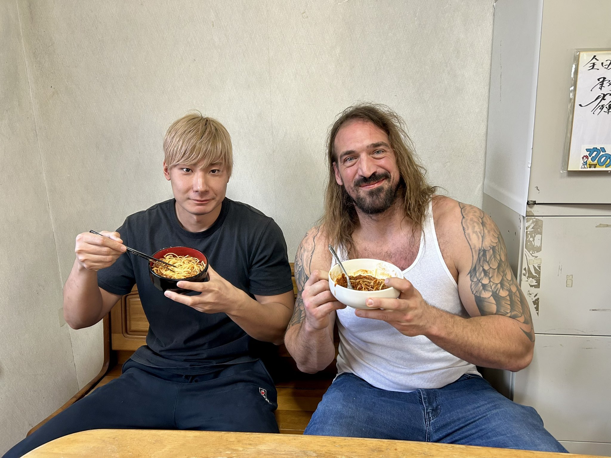 >Inamura also confessed that he had admired Sugiura since he was a boy. “Back then I was in junior high school, and I thought, ‘Is there really a man this cool?’” After joining NOAH and debuting, Sugiura began inviting him out to meals. “I started pro wrestling late by industry standards—I was 25. But Mr. Sugiura started at 30, so he told me, ‘Compared to me, you’re still young…’ He’s my mentor. In every respect he influenced me and had an impact on me.” That’s why, he recalled, he couldn’t hide his shock when he heard in the U.S. that Sugiura had joined T2KX.