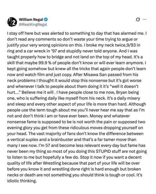 The reason for Misawa's neck problems was because him and Kawada worked an insane "I droppa you, you droppa me" match in 1999 as Giant Baba was in the audience and had about a week left to live. Did Regal want Baba to die without seeing a five-star match?